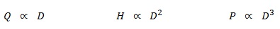 In the same way, the volumetric flow of the pump (Q) is linearly related to impeller diameter (D), the head (H) is proportional to its square, and the power requirements (P) to its cube: