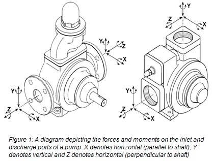 Figure 1 shows the forces and moments acting on the inlet and discharge ports of a pump at any given time. Should any of these forces combine to give an excessive resultant force, damage will occur to the pump system.